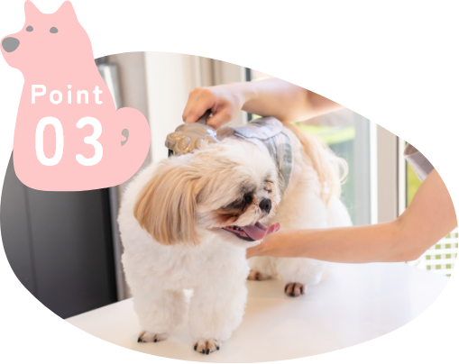 大型サロンのような流れ作業ではなく、その子の性格・体調・皮膚の状態に合わせて最適なトリミングを実施します。